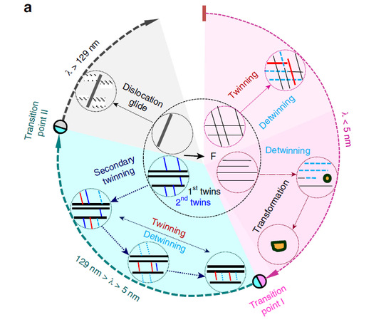 纳米孪晶有望解决材料强韧性矛盾这一科学难题。不同尺度孪晶的变形机制是控制强度-塑性协同关系的主导因素。因此,微纳尺度孪晶变形行为的解析对微观结构的设计和高性能材料的制备具有重要意义。本研究工作将透射电镜下的原位拉伸试验与位错基理论模型和分子动力学模拟相结合,揭示了孪晶变形的尺度效应,并建立了几纳米到几百纳米孪晶变形图谱。原位拉伸实验发现孪晶变形存在两个临界尺度:当孪晶尺度小于5 nm时,以一级孪晶的孪晶化和退孪晶化为主;当孪晶尺度为5 - 129 nm时,由一级孪晶变形转变为二级孪晶变形;当孪晶尺度大于129 nm时,以一级孪晶内部的位错运动为主。力学模拟和分子动力学模拟结果与原位观察的尺度效应高度一致,阐明了由不全位错滑移引起的内禀机制和演变过程。该工作对于先进高强高韧钢的结构设计和轻量化应用有重要意义。该工作得到国家自然科学基金委、上海市科委项目资助。