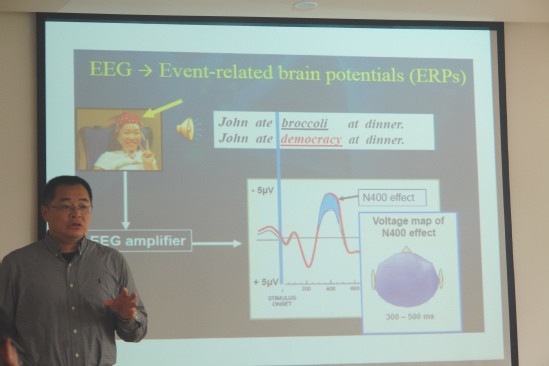 随后,张辉教授在讲座中介绍了ERP研究实验设计的基本知识及注意事项,通过典型英汉语义加工实验案例,深入浅出地讲解了ERP实验的不同变量,具体阐述了控制变量和科学的ERP实验设计方法。随着张辉教授对实验设备、数据分析、实验设计要点等一一讲解,听众对神经认知语言学和ERP实验有了详细的了解。张辉教授鼓励外语学院师生尝试新的研究领域,多看前沿文献,自己动手设计并参与实验过程,在理论知识基础上进行实证研究。本次讲座持续两个半小时,由外语学院副院长韩戈玲教授主持。