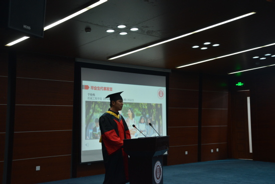 孙涛副教授代表导师发言,他用“驭浪前行”表达对学生的嘱托和期望。他希望同学们在新的阶段能够保持一颗感恩向善的心,获得更多前行的动力与勇气;他叮嘱同学们要保持自律专注的态度,选好目标,落到实处;他期望同学们能够始终保持持续学习的能力,化解潜在危机,平衡好自己的工作与生活。