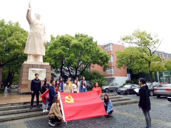 4月29日下午2点,细雨蒙蒙,空气中弥漫着青春的气息,正值五四青年节的到来之际,外语学院研究生党员和积极分子在支部书记唐瑾老师带领下,在毛主席像前进行庄严的入党宣誓。同学们托起鲜红的党旗,举起右手握紧拳头,庄严地进行入党宣誓。“我志愿加入中国共产党,拥护党的纲领,遵守党的章程,履行党员义务,执行党的决定,严守党的纪律,保守党的秘密,对党忠诚,积极工作,为共产主义奋斗终身,随时准备为党和人民牺牲一切,永不叛党。”