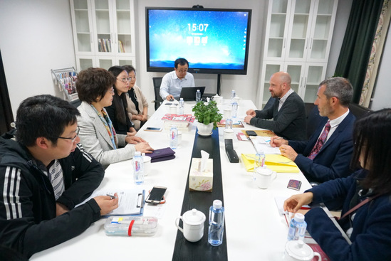 此次交流在沪江学院会议室拉开序幕。陈红对法国国际音像学院执行校长Anthony Chevalier一行来沪江学院交流表示热烈欢迎。她介绍了沪江学院的主要职责和发展现状,以及着力促进留学生“引进来”和本土学生“走出去“的情况。她表示,作为学校的国际化学院,沪江学院一直致力于结合学院特色,充分发挥人才培养优势,积极拓宽国际视野,搭建国际交流与合作的平台,希望今后加强与法国国际音像学院的合作,促进师生的学术交流与合作。Anthony Chevalier表示非常感谢沪江学院的热情接待,期待与沪江学院积极开展师生互访,加强交流。Anthony Chevalier一行参观了学校音乐堂,观看了音乐系室内乐团学生练习和学生演出视频,并与音乐系教师就艺术教学与管理模式等进行了热烈的交流。