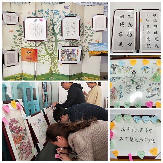 作品展出后,立即吸引了众多喜爱书画的教师与学生前来参观。大家驻足欣赏,感叹理工科师生的精湛技艺和艺术涵养,感受浓郁的中华优秀传统文化气息和艺术宣传氛围。受到作品感染,很多师生纷纷用便利贴写下美好祝福:“我们用青春为祖国歌唱,献礼中华人民共和国70周年华诞!祝愿伟大的祖国繁荣昌盛!”“祝上理,祝医食越来越好!”