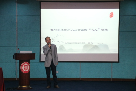 之后,薛老师从国家级非物质文化遗产代表性传承人马金山的“花儿”人生、“花儿”的研究现状、如何保护“花儿”、老艺术家马金山的愿望等方面娓娓道来。薛老师指出“花儿”是人们情感的真实流露,“花儿本是心上的话,不唱由不得咱家”,“花儿”具有浓郁的乡土气息与独特的艺术魅力,无不渗透着中国传统文化的印记,具有重要的历史价值与现实意义。但是,随着社会经济的发展、人们生活方式的改变、老艺人的离世,“花儿”的保护与传承面临严峻的考验,如何保护与传承非物质文化遗产、如何继承与弘扬优秀的中华传统文化,已成为实现中华民族伟大复兴中国梦的重要课题。