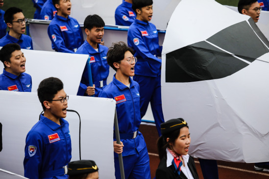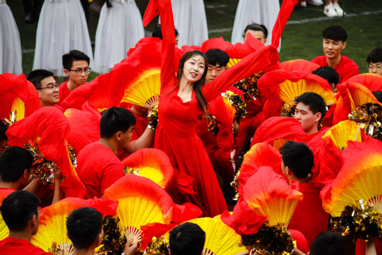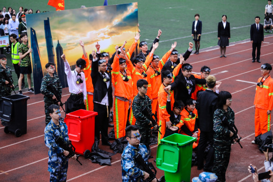 开幕式上,来自学校的19支队伍在国旗队的带领下依次走过主席台,为大家带来了别具一格的入场式表演。2019年是新中国成立70周年,各参演方阵也在开幕式中融入了诸多爱国元素:五四青年的学生装、嘉兴南湖的游船、红军战士的冲锋号等,展现了理工学子热忱的爱国心。此外各个学院也充分展现了各自的学科特色:3D打印大飞机、免疫系统的三道屏障、5G信号塔等都直观地表达了学子们对知识的热情。今年的教工韵律广播操表演和学生军体操展演也展现了我校师生良好的精神面貌。