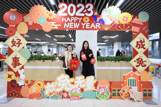 今天(15日),上海迎来2023年的初雪。室外雪花纷飞、寒意袭人,而在上海理工大学思餐厅里,则是一片红红火火、暖意融融的景象:步入小年,春节脚步临近,大学的餐厅里挂满了喜气的红灯笼,年味十足;背景墙上,“2023新年快乐!好事成兔(谐音Two)!”的祝福语,也引得师生们纷纷前来拍照、打卡。