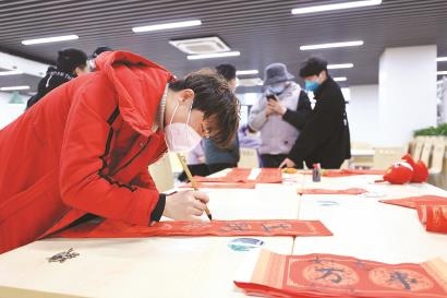 赏年俗、品美食、领奖品,留校学生们享受着温馨的校园年味。“今年留校过节不孤单!”材料学院大四学生刘明杰还在现场写了一副春联,打算晚上贴在寝室门上。