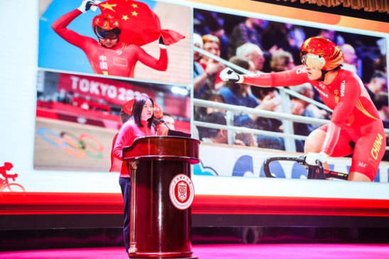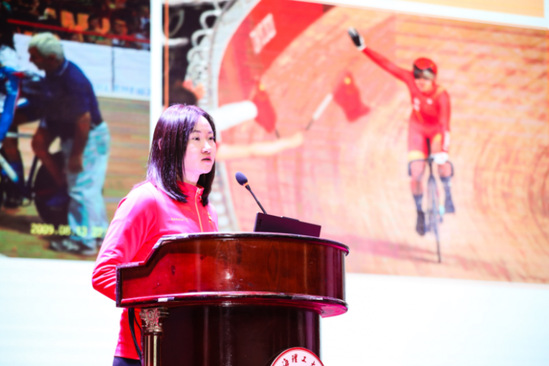 “场地自行车运动员的装备价值多少?”当两届奥运冠军钟天使向参加报告会的400多位上理师生抛出这一问题的时候,顿时引起台下的热烈讨论。对于这一明显超出大多数学生认知的问题,钟天使的回答是:“不包含运动员的服装和头盔,仅一辆场地自行车的价值就在20万左右。”台下师生不由得发出一阵由衷的赞叹。这是近日发生在上海理工大学党的二十大精神宣讲报告会上的一幕。应学校邀请,党的二十大代表、里约和东京两届奥运会场地自行车冠军钟天使来到上理,为师生们作“传承为国争光红色基因,勇担体育强国时代使命”的主题报告。