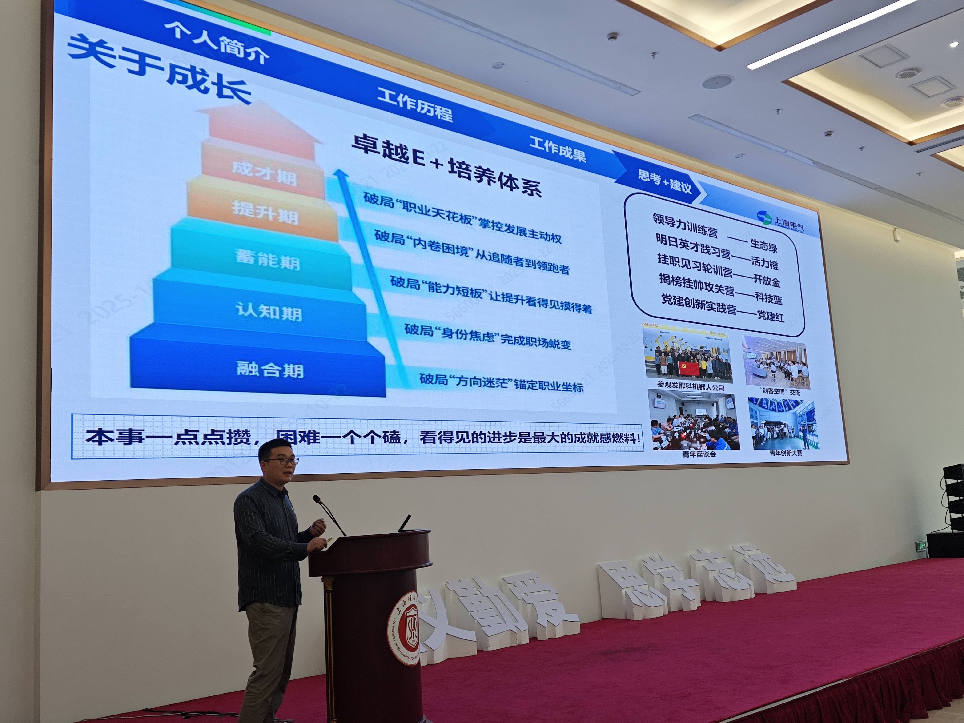 上海汽轮机厂技术发展处处长助理、我校2014届能动学院校友王鹏从个人成长历程、工作成果、思考与建议等方面做了分享。作为从母校走出、在上海电气实现职业成长的“过来人”,他结合自身的工作经历与成长感悟,向学弟学妹们讲述了自己在上海电气的职业发展路径,分享了在工作中解决技术难题、参与重大项目的宝贵经验,并从行业前景、职业规划等角度为学子们提供了实用的建议。他真诚的分享不仅拉近了与在场学子的距离,也让学弟学妹们对能够加入上海电气充满了期待。