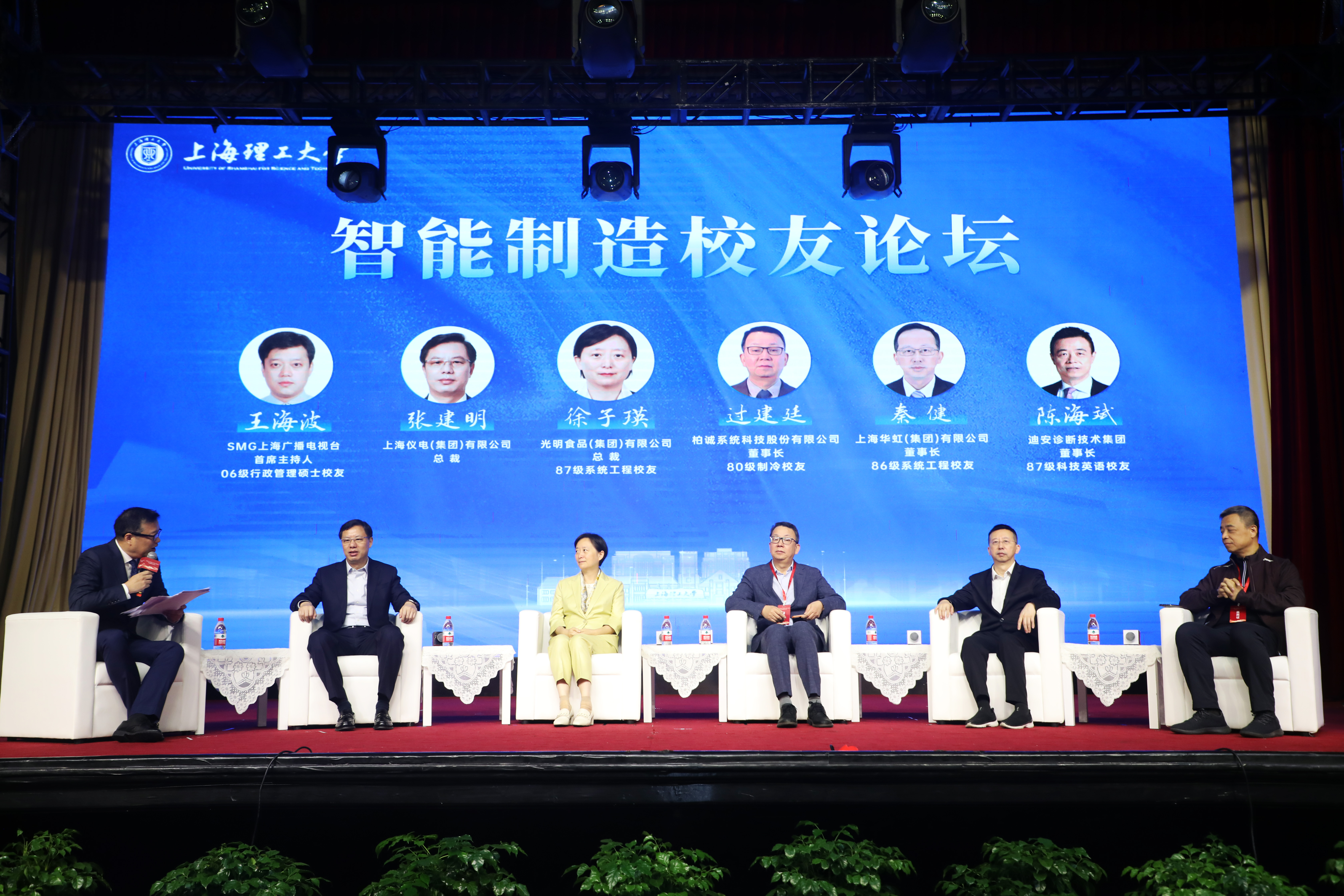 在智能制造校友论坛环节,SMG上海广播电视台首席主持人王海波、柏诚系统科技股份有限公司董事长过建廷、上海华虹(集团)有限公司董事长秦健、光明食品(集团)有限公司总裁徐子瑛、迪安诊断技术集团股份有限公司董事长陈海斌、上海仪电(集团)有限公司总裁张建明等六位校友嘉宾和特邀嘉宾,围绕智能制造、产业创新、人才培养等分享真知灼见,彰显了上海理工大学作为“制造业黄埔军校”的深厚底蕴与使命担当。