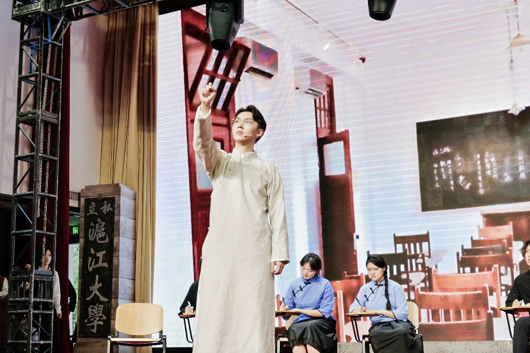 该剧以独特的艺术手法,构建了"历史使命"与"家庭温情"双主线叙事。剧情采用倒序结构,从1938年刘湛恩校长遭日伪特务暗杀的悲壮场景切入,层层回推至1928年他出任沪江大学校长就职典礼的重要时刻。倒叙的叙事方式让观众在悬念中逐步走近这位爱国教育家的内心世界。剧目通过"教育救国、公民教育"的办学理念,展现刘湛恩老校长的远见卓识;也有与女儿刘光坤对话的温馨片段,还原他作为父亲柔情的一面;在"沪江校园建设"场景中,演员们通过精湛的表演,再现了刘湛恩校长带领师生在战乱年代坚持办学的艰辛历程,当"读书不忘救国,救国不忘读书"的经典台词响起时,台下总能响起经久不息的掌声。