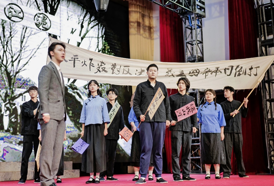 "没想到在那么紧张的时间内,我们能一起完成这么一部令人震撼的话剧,希望我们能一起将刘湛恩校长的精神传递给更多人。"2025年版刘湛恩的扮演者、基础学院大一新生田诗瑜分享到。为了演好这个角色,他不仅在台词和表演上下足了功夫,更是和剧组同学们一起参观校史馆、刘湛恩烈士故居红色文化主题馆,提前了解刘湛恩校长的生平事迹,主动感悟和理解他的精神世界。剧中幼年刘光坤的扮演者赵安楠则讲述了一个暖心细节:"排练时,前几届的学姐特意来指导我,分享给我对角色的感悟,使我更好的表演。这种代代相传的帮助,让我感受到了剧组的温暖。"
