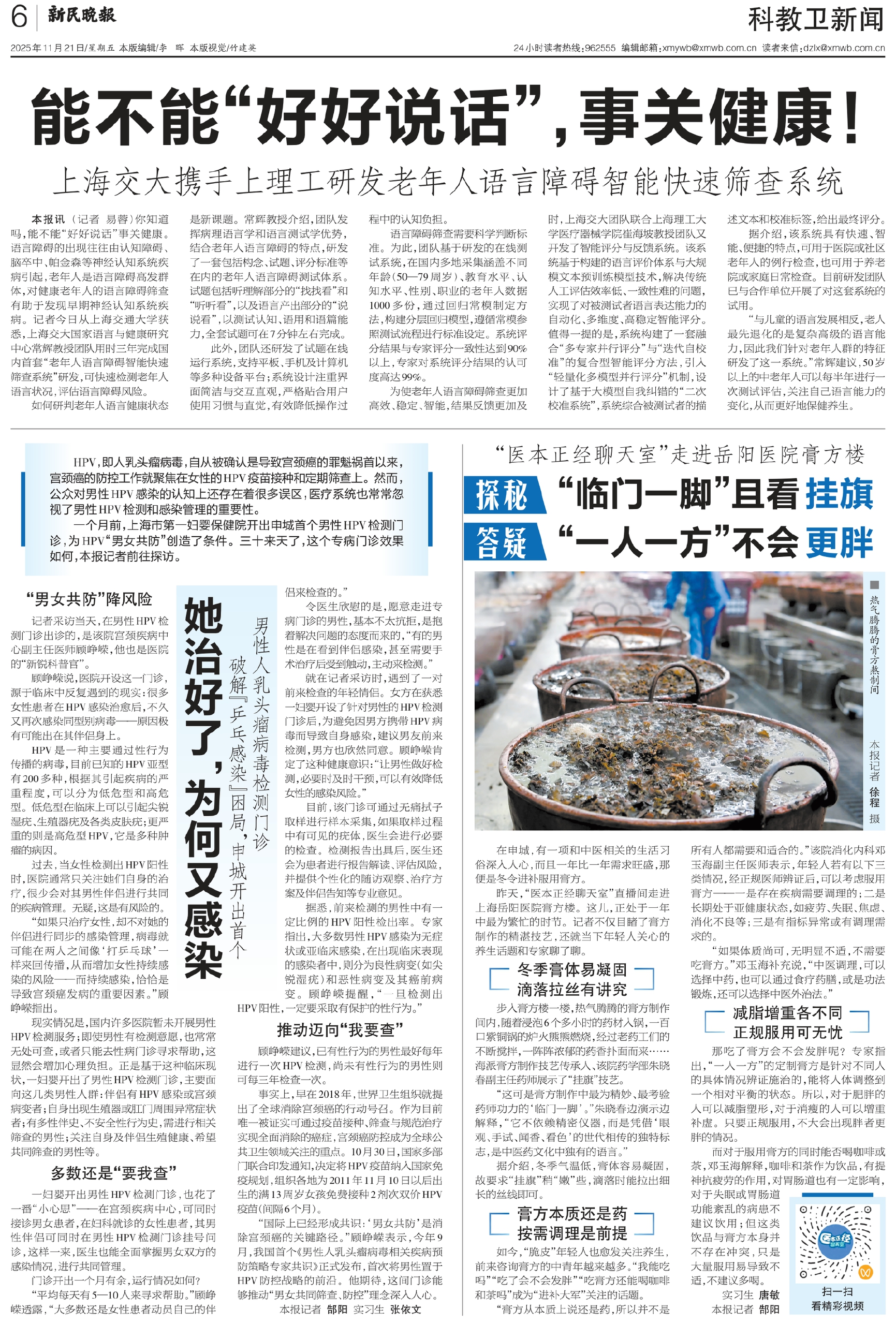 你知道吗,能不能“好好说话”事关健康。语言障碍的出现往往由认知障碍、脑卒中、帕金森等神经认知系统疾病引起,老年人是语言障碍高发群体,对健康老年人的语言障碍筛查有助于发现早期神经认知系统疾病。记者今日从上海交通大学获悉,上海交大国家语言与健康研究中心常辉教授团队用时三年完成国内首套“老年人语言障碍智能快速筛查系统”研发,可快速检测老年人语言状况,评估语言障碍风险。