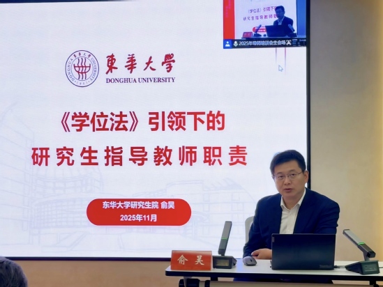 11月5日的开班仪式上,研究生院院长崔国民首先代表学校向通过严格遴选的导师队伍新成员表示热烈祝贺与诚挚欢迎。他强调,研究生导师作为研究生培养的第一责任人,肩负着“传播知识、传播思想、传播真理,塑造灵魂、塑造生命、塑造新人”的时代重任,其履职能力直接关系到学校研究生教育质量与高层次人才培养成效。东华大学研究生院常务副院长俞昊教授受邀作题为“《学位法》引领下的研究生指导教师职责”的专题辅导。报告中,俞昊基于多年研究生教育管理经验与实践积累,系统解读《学位法》为研究生培养工作及导师职责赋予的新内涵和制度导向。他强调,导师应自觉成为研究生学术研究的引领者、学术规范的守护者和成长成才的护航者,切实履行《学位法》赋予的责任与使命。