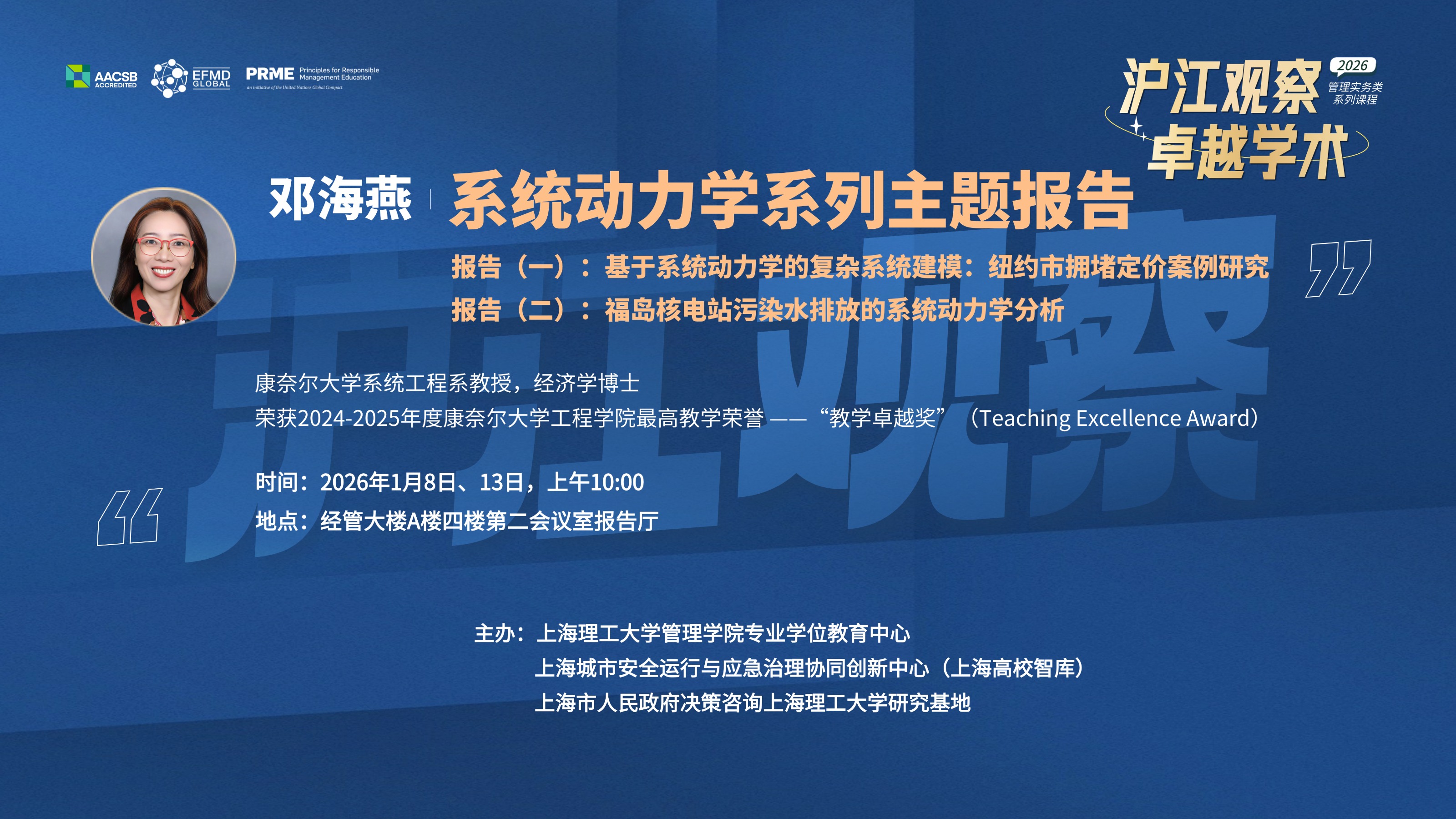 报告人简介:邓海燕,康奈尔大学系统工程系教授。本科毕业于北京大学光华管理学院,随后于加州大学戴维斯分校(UC Davis)获经济学博士学位,是一位在系统工程、经济学、商学与定量分析领域深耕多年的跨学科专家。作为核心研究成员,曾深度参与“世界贸易流数据库”(World Trade Flows)与“宾夕法尼亚世界表”(Penn World Table, PWT)等国际知名经济数据库的开发工作。她擅长通过开发综合分析模型与系统模拟来应对复杂的社会挑战,并主持多项研究课题,为重大政策决策提供精准数据支持。因在教学方面的卓越贡献,荣获2024-2025年度康奈尔大学工程学院最高教学荣誉——“教学卓越奖”(Teaching Excellence Award)。