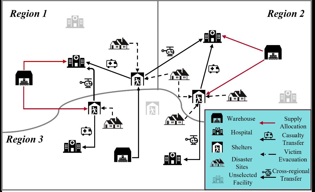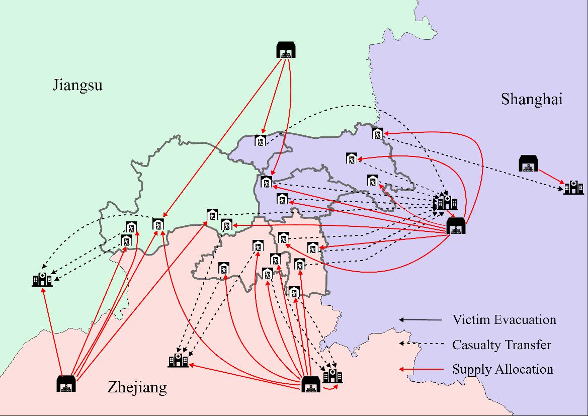 在宏观系统规划层面,赵来军教授团队连续取得突破。针对城市群灾害应急响应中,面对地面道路受损、跨城距离远、医疗资源配送不均等难题,提出了韧性导向的协同应急设施选址-分配模型,创新将直升机跨区域转运机制融入网络设计,构建了“空地协同”救援新模式。以长三角示范区为案例的仿真表明,应急响应时间可缩短1.26小时,网络韧性提升19.51%,跨区域协同救援对提升“黄金救治时间”保障能力有显著价值。