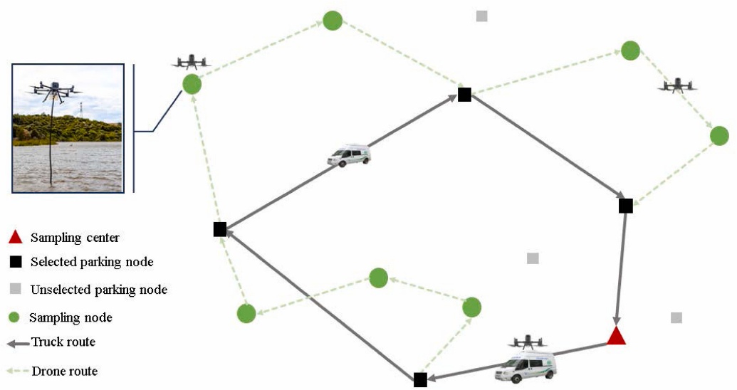 博士生党烁的研究直面无人机单机作业的续航与载重限制,构建了面向河网水质监测的“车机协同”系统。通过创新双目标路径规划与协同调度模型,并集成车辆移动基站与无人机硬件平台,实现了无人机的不间断循环作业,为构建高效、经济的城市生态监测网络开辟了新路径。