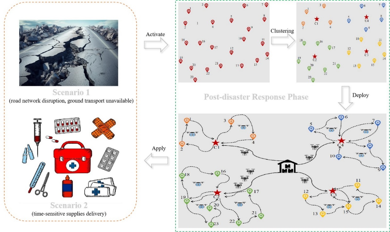 赵来军教授团队以“韧性导向的城市群应急协同响应网络的p鲁棒选址-分配模型研究”( A p-Robust Location-Allocation model for Resilience-Oriented collaborative emergency response network in urban agglomerations)和“基于分布鲁棒优化的地震灾后道路受阻情境下母-子无人机协同药品配送调度优化研究”( Distributionally robust scheduling optimization for pharmaceutical delivery Using coordinated mother-end drones under post-earthquake road disruptions)为题发表于《交通运输研究E辑:物流与运输评论》(Transportation Research Part E: Logistics and Transportation Review)。