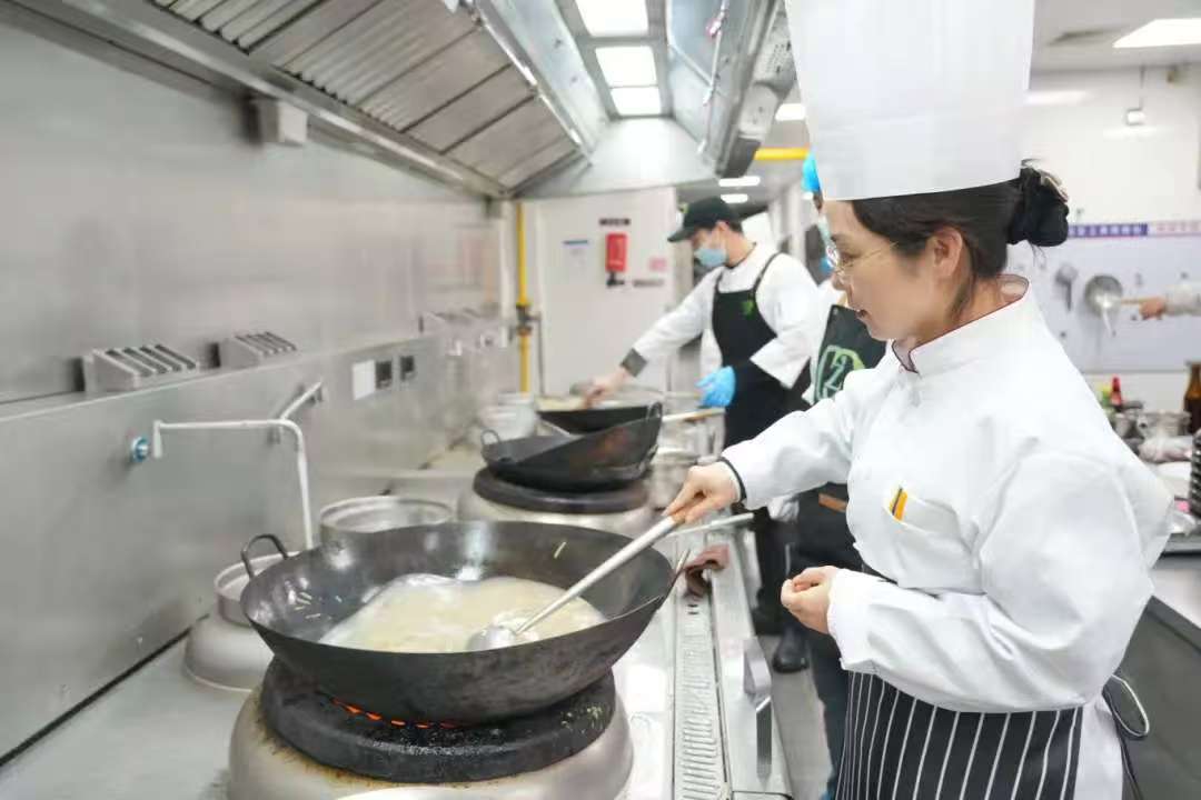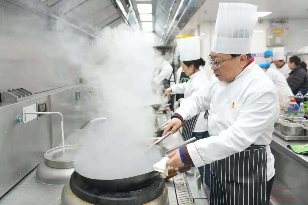 校领导们系着围裙,戴着厨师帽,正将刚出锅的宫保鸡丁、可乐鸡翅等装盘