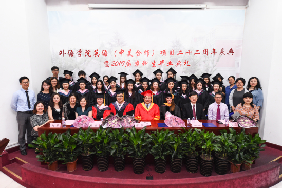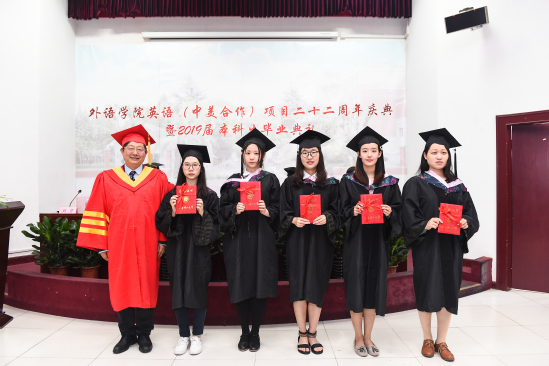 6月3日下午,外语学院英语(中美合作)项目22周年庆典暨2019届本科生毕业典礼在学院报告厅举行。我校副校长张华教授,美国纽约市立大学皇后学院科研与教务副教务长、助理副校长Alicia Alvero教授,美国纽约市立大学皇后学院经济系汪滔教授,外语学院党政领导、系部负责人、中美双方教师代表、学生家长和2019届英语(中美合作)专业毕业生共同欢庆盛典。典礼由外语学院院长刘芹教授主持。 首先,Alicia Alvero教授作毕业致辞。她代表皇后学院向毕业生们表示诚挚的问候,对上海理工大学领导、老师、家长们对教育的辛勤付出表示感谢。Alicia Alvero教授讲述了成为一个成功人士的必要品质,希望毕业生们成为一个幸福的成功的人。 我校副校长张华教授发表讲话。张华教授向Alicia Alvero教授和汪滔教授的到来表示欢迎,向所有参与、支持此项目的老师、家长们表示感谢。他充分肯定了外语学院在我校全方位推进高水平大学建设之际,发挥人文学科特色,争当新时代排头兵、先行者的重要角色。他希望毕业生们牢记“信义勤爱、思学志远”校训,努力工作,积极向上,奋发有为,在各自的工作岗位上开创骄人的成绩。 激昂欢快的音乐声中,全体领导、嘉宾依次为获得“上海市优秀毕业生”、“上海理工大学优秀毕业生”、“国际联合语言学院优秀毕业生奖学金”、“思源校友奖学金”的学生颁奖。 外语学院第一届国际合作项目毕业生、“思源校友奖学金”的创立人李臻先生因公务无法到达现场,毕业生代表在现场转达了他的寄语。他向学院对自己的培养表示衷心感谢,希望毕业生们保持一颗坚毅的心,探索自己的人生方向,在痛并快乐的生活中创造属于自己的幸福。全体毕业生依次上台领取联合语言学院证书。外语学院教师代表瞿莉莉、家长代表董媛女士发言,毕业生代表郑芷鑫和首届2+2项目毕业生代表童玮琳发言,对母校表达了浓浓的情意。 在全体师生们合影、留念与依依不舍中,典礼圆满结束。