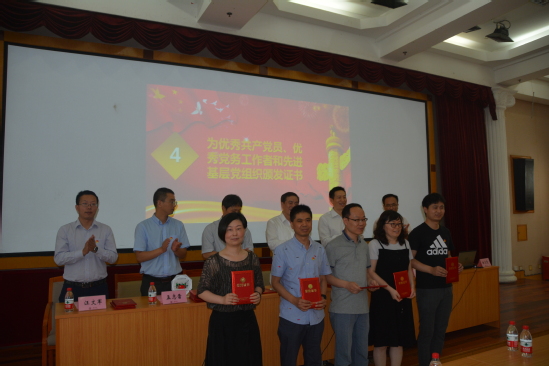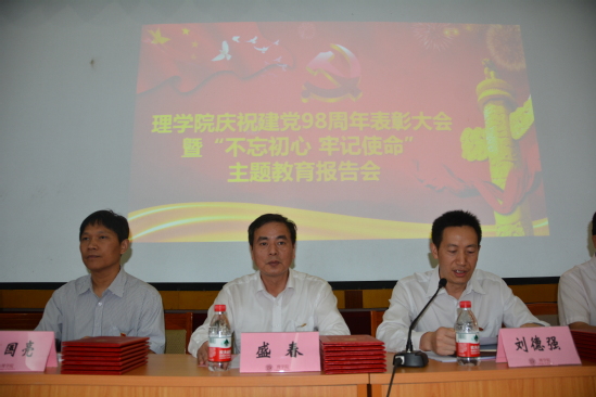 6月19日下午,理学院在管理学院五楼会议室召开庆祝建党98周年大会。学校党委副书记、副校长盛春和理学院全体党员参加了会议,会议由理学院党委书记刘德强主持。 会议伊始,在激昂雄壮的乐曲声中,全场起立,高唱《中华人民共和国国歌》。随后,全体党员重温了入党誓词,表达对党的忠诚、为共产主义事业奋斗终身的决心。 理学院党委副书记、院长魏国亮宣读文件《关于表彰优秀共产党员、优秀党务工作者和先进基层党组织的决定》,表彰在理学院基层党建工作中涌现出的26位优秀共产党员、6位优秀党务工作者及5个先进基层党组织。盛春和理学院党委委员为获得荣誉的集体和个人颁发荣誉证书。 在党的第98个生日来临之际,理学院为党龄10年、15年、20年、25年、30年以上的教师代表过一次集体政治生日,并邀请盛春为他们佩戴党徽,激励理学院全体党员不忘初心、牢记使命、担当有为、从“新”出发。 会上,优秀党务工作者代表童元伟介绍了做好支部工作的三点体会。优秀党员教师代表汪文军分享了自己在教学科研工作中的感悟,缪煜清分享了“铋科学与生物医学材料研究团队”的组建及科研成果。学生党员代表蔡洁报告了自己在研究生会及支部的工作经历。 盛春在讲话中指出,当前学校党委正在上下一心,攻坚克难,全力推进高水平大学建设,理学是工科发展的基础,对学校五大一流学科的建设起着重要支撑作用,发展好理学、建好理学院,对推进学校高水平大学建设有着重要意义。为此他提出三点要求:一是要始终坚持党的领导,把政治建设摆在首位;二是要切实增强党员意识,发挥党员作用;三是要坚持全面从严治党,不断加强党风廉政建设。他希望理学院全体党员,不忘初心,牢记责任使命,在党为党,在校建校,团结和带领广大师生员工,锐意进取、扎实工作,为推进学校和学院的快速发展而不懈奋斗! 报告会上,马克思主义学院胡绪明教授为理学院全体师生党员作了一场具有政治高度、理论深度、实践广度的主题教育报告。胡绪明教授以习近平新时代中国特色社会主义思想为指导,以共产党人的初心为出发点,围绕着新时代党的历史使命,从 “四个自信”“两个维护”“从严治党”等多个层面,运用详实的资料和生动的案例,深刻阐述了中国共产党人初心使命的丰富内涵和实践要求。