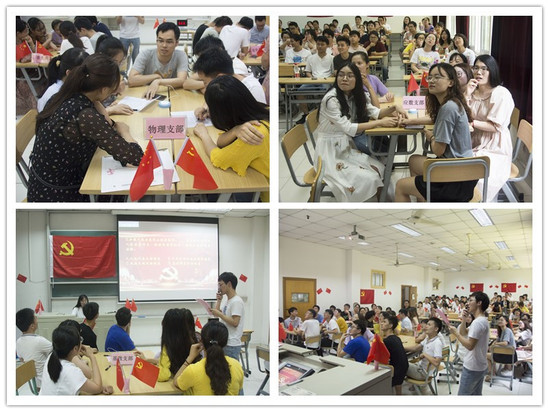 6月28日下午,理学院研究生各党支部组织开展了“学习强国”知识竞赛主题活动。学院党委副书记孟志雷、全体研究生党员及入党积极分子参加了本次活动。 孟志雷为活动致辞。他指出,开展“学习强国”知识竞赛活动,一是检验各支部党员的学习成效;二是进一步加强党员间的线下交流学习,增强支部凝聚力,充分发挥党支部的战斗堡垒作用。希望以此次知识竞赛活动为契机,形成“以赛促学、以学促做、融会贯通”的良好学习氛围。 综合学习强国积分情况及个人理论素养,各党支部评选出本届“学习强国标兵”,树立优秀榜样,不断激励全体党员、积极分子锐意进取。随后,理学院研究生辅导员汪婷为获得荣誉的标兵党员现场颁发奖品并合影留念。 “学习强国”知识竞赛共有来自12支队伍的84名选手参赛,竞赛以“学习强国”平台知识为主要内容,分为必答题、限时答题和抢答题三个部分。竞赛中选手们精神饱满、抢答积极,并沉着冷静地应对主持人的提问,既体现出个人风采,又展现出团队合作精神。同时,活动趣味性十足,对各环节排名首末位的队伍实施了奖惩措施,“颁发定制优盘”“跳绳指压板”“气球指压板”等活跃了现场气氛。近一个小时的激烈角逐,是对学习效果的真实检验,更是对全体党员的直观教育,在全院师生中引发了良好的反响。 为强化党员仪式教育,活动中,由研究生化学党支部组织委员王玉贵领誓,带领在场党员重温入党誓词,再次表达对党的忠诚和为共产主义事业奋斗终身的决心。