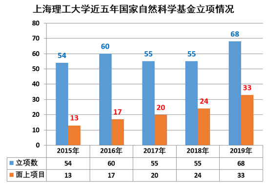 立项总数创历史新高。2019年我校共申报358项国家自然科学基金,其中68项获批立项,立项率为18.99%,立项数创历年新高,比2018年增加23.6%,连续6年超过50项,连续9年在上海市地方高校中排名第二。国家自然科学基金立项总数的不断增加,体现了我校基础研究能力持续提高,创新氛围愈发浓厚。