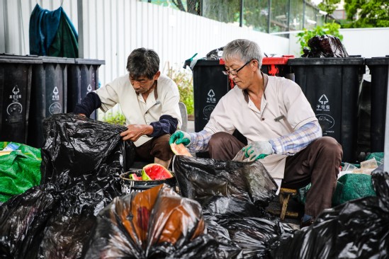 【卯时】 日出 31℃ “沪上垃圾四只桶,红蓝黑棕各不同,害回湿干分开放,人人参与有担当。”清晨6点刚过,酷夏的太阳已很是毒辣。比太阳更“辣”的,大概就是垃圾桶了——扔垃圾的人忍着异味,扔下垃圾后匆匆离去。负责垃圾分类的段年生师傅每天都会与垃圾“零距离”接触 ,忍着恶臭进行垃圾二次分类。“这么热的天,倒胃口也是难免的,希望大家扔垃圾时做好垃圾分类,这样我们的工作会轻松一些,校园也会更美丽!”