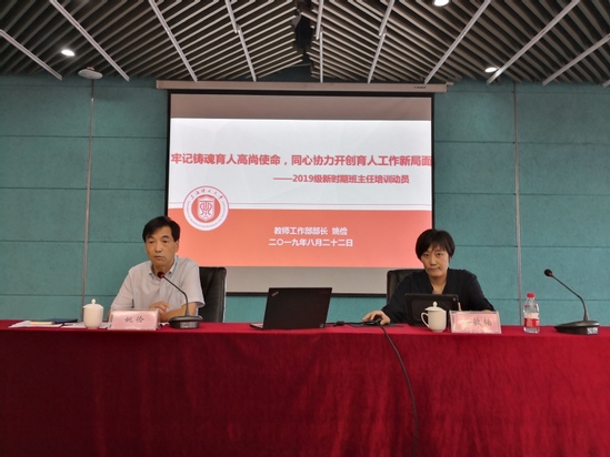为贯彻落实全国高校思想政治大会、全国教育大会精神,推进学校“全员育人、全过程育人、全方位育人”,2019年,学校印发《关于进一步加强新时期本科生班主任工作的实施意见》,积极推进新时期本科生班主任工作。为提高2019级本科生班主任的专业能力和职业素养,更好地服务学生,2019年8月22日上午,学校在图文信息中心第一会议室举行2019级本科生班主任培训工作。学校相关职能部门和学院负责同志、所有2019级本科生班主任共150余人参加。 教师工作部部长姚俭作了题为“牢记铸魂育人高尚使命,同心协力开创育人工作新局面”的动员报告。他表示,新时期班主任工作是学校对国家要求“加强高校思想政治工作”的积极响应,是学校“坚持把立德树人作为中心环节,把思想政治工作贯穿教育教学全过程”的有效举措。大学班主任的责任重大,使命光荣,能够在学生思维定型、人格塑造的关键期,通过潜移默化的引导和教育,使学生增强使命担当意识,立德成人、立志成才,树立正确世界观、人生观、价值观,把爱国情、强国志、报国行自觉融入国家事业的发展中。新时期本科生班主任,要在开展思想政治教育、加强班风学风建设、加强班级指导管理、做好学术引导和就业指导等方面工作的基础上,积极创建班级特色品牌,运用好“电子班级”系统密切与学生的沟通。同时,学校将积极搭建平台,加强班主任的交流和培训,开展考评和表彰。 “金教棒奖”获得者李秀君老师以“倾注耐心、爱心、责任心,享受班主任工作的快乐”为主题,从“班主任现状分析、2000后大学生特质和常见问题、班主任主要职责和工作技巧、案例分析”等方面,分享了她从事班主任工作10余年的心得。她指出,要做好新时期的班主任,要在了解现在学生特点的基础上,与时俱进,创新工作方法,既要有威信,也要有亲和力和自身魅力,关键在于与学生沟通的耐心、关注学生方方面面的爱心和对班主任工作高度重视的责任心。 信息办介绍了新时期本科生班主任工作信息化配套系统——电子班级的建设情况,并对电子班级系统的使用进行了系统培训。电子班级系统为师生间的交流互动提供了一个网络平台,便于班主任及时了解所带班级学生的动态,为班主任对学生的个性化指导提供服务,也有利于学生随时与班主任开展互动并对班主任工作进行评价。 经过自愿报名和精心遴选,目前,共有132名教职员工担任2019级本科生班主任(其中党政管理干部42名,专业教师90名)。
