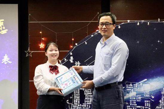 程旺书记给新生代表刘霏霏赠送礼包