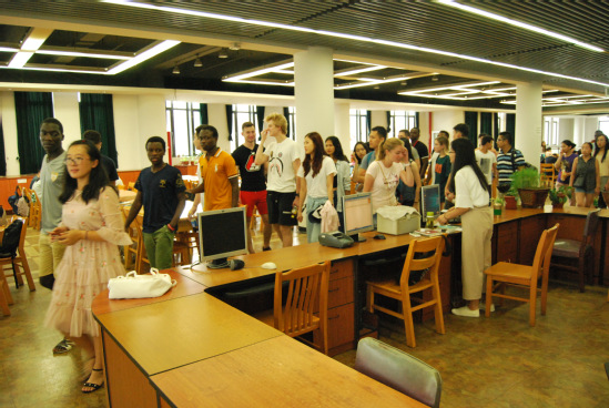 图书馆周炳娟老师为1100号新生做讲座 此外,图书馆老师还带领部分新生参观图书馆,给新生示范如何检索、借阅和归还图书馆书籍。介绍图书馆的空间与馆藏资源、各楼层的功能与分布、图书馆利用的规章制度,并在图书馆开展新生“第二课堂”的主题班会活动,激发同学们利用图书馆的兴趣。 针对本科国际生在图书馆日常学习、研究的需求,图书馆老师全程用英文综合介绍了图书馆概况、纸质资源和电子资源利用、图书馆相关服务和培训等内容,并在讲座结束后带领大家参观图书馆,并进行了互动、交流,对同学们关心的问题更是进行了详细的解答。 图书馆还将在主校区继续开展针对新生的图书馆资源讲座,力争做到新生100%全覆盖。不仅如此,阅读推广活动也在紧锣密鼓的筹备中,将为新生带来更丰富更有乐趣的读书体验。