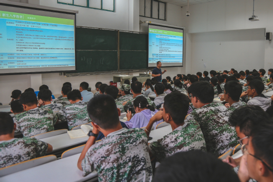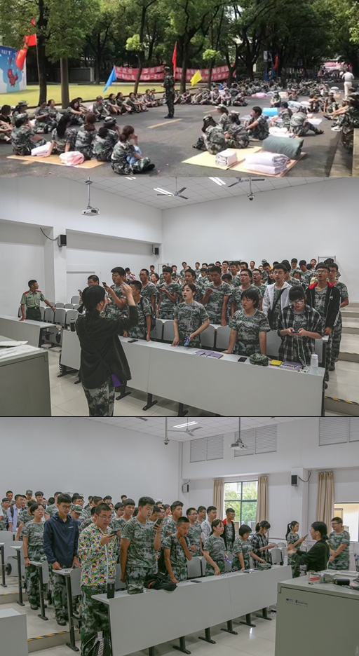 蓬勃朝气的新上理人 理论教育提素养,齐抓共管暖人心 学校历来重视军训新生的思想政治教育,除军事训练外,各种理论课程也在同步进行。军事理论课教学于每周一至周五晚分两周先后在三个校区进行,由校领导、辅导员、部分职能部门负责人等50人为新生授课,同时邀请国防大学政治学院张鑫和李志刚教授开展专题讲座,课程以听写说看的形式,从军事思想、军事高技术、国防和周边安全四方面为新生带来了一场别开生面的军事知识课堂,今年军事理论课教学还首次尝试将新时代中国说(大学生讲思政)慕课融入教学内容。接下来,学校还将开设新生认知教育课程,让新生尽快熟悉学校制度,提升理论素养,坚定理想信念,在军训中精进不休。 此外,学校各部门也为高质量实现军训目标提供坚实保障。新生辅导员全程跟训,服务新生,全力配合教官工作;军训工作组老师深入一线,及时协调处理各项军训事宜,全程保证军训顺利进行;校医院为军训配备专门的驻军医生,提供全天医疗救助服务;各区食堂贴心关怀,为雨天参训师生提供免费姜汤;体育教学部、保卫处和后勤管理处鼎力支持,为参军师生协调军训场地,全校上下,戮力同心,共同为军训保驾护航。
