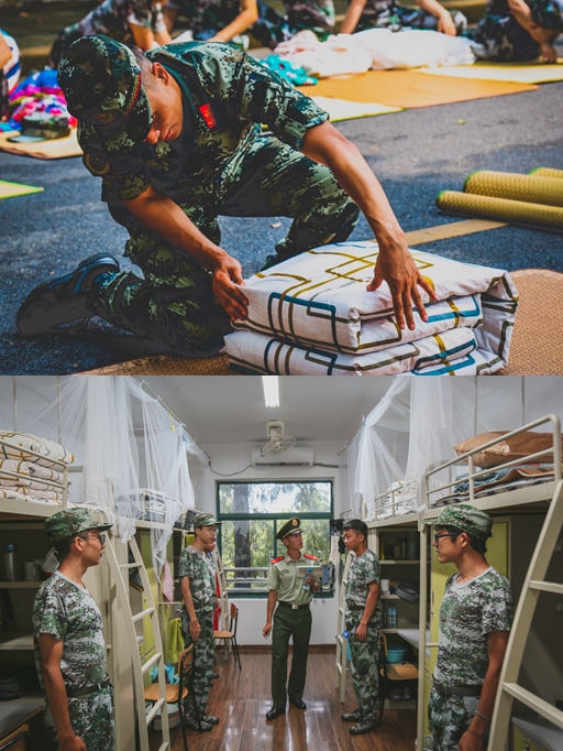教官与学生亦师亦友 内务整理练素质,风纪严谨显意志 出门看队伍,进门看内务。第二届军训内务整理赛如期举行,承训教官走进新生宿舍手把手地教学生整理内务,开启整洁生活。在新生宿舍,教官对被子折叠、床铺整理、衣物收纳、生活用品规范摆放、室内整体清洁等提出了严格的要求,“鞋要摆成直线”“寝室内无杂物垃圾堆积”“生活用品与食物分开摆放”……针对叠被的“老大难”问题,教官进行了细致的讲解,并进行亲自示范。他们以流畅的动作,娴熟的技巧,不到一分钟就把松软的被子叠得棱角分明,俨然一个标准的“豆腐块”,在场的学生都发出阵阵惊叹。 内务整理的内涵并不局限于简单的物品归纳摆放,更是个人纪律性和条理性的体现。新生们在教官的指导下,从最初的不标准到最后的堪称完美,在不断地反复练习中,锻炼了意志品格,养成了自律生活的好习惯。
