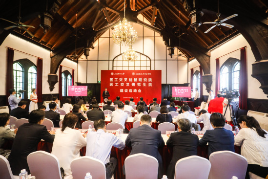 上海交大医学院院长陈国强致辞 在到场领导嘉宾的共同见证下,我校副校长刘平,上海交通大学医学院党委副书记、副院长吴韬代表两所高校签署了《共建医工交叉创新研究院合作框架协议》。丁晓东和陈国强共同为医工交叉创新研究院、医工交叉研究生院揭牌。