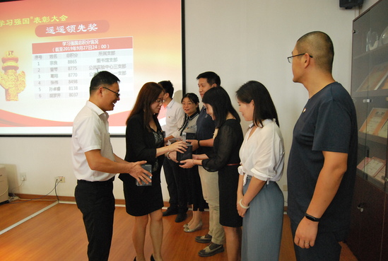 9月29日,为了庆祝中华人民共和国成立70周年,推动学习型党组织建设,巩固“学习强国”推广使用成果,进一步激发全体党员主动学习、持续学习的热情,图文信息党委在图书馆八楼举行“学习强国”阶段表彰和学习交流活动。 表彰活动充分利用“学习强国”学习管理系统,评选出总积分在8000分以上的“遥遥领先奖”6名、总积分在6000分和8000分之间的“渐入佳境奖”6名和近7日积分前10名的“天天向上奖”。图文信息党委书记孙萍、副书记陈世平和周亦敏为获奖学员颁奖。 表彰会上,学员宗良、曾琴、林琛、胡梦芹和葛翔交流了使用“学习强国”开展学习的感悟。他们认为,“学习强国”因其极强的时效性、内容的丰富性,已经融入了到大家的日常生活中,在家里或上下班的路上点开进行学习已经成为了生活中不可缺少的一部分。 最后,孙萍讲到,“学习强国”平台由于其内容涉及面极广,使得党员的学习更加综合、学习方式更加多样,学习时间更加灵活,所以吸引着广大党员随时随地了解国家时政,与祖国同步。她鼓励广大党员今后要更加自觉运用好学习平台,把学习作为一种追求、一种爱好、一种健康的生活方式,学习各方面的知识,开拓视野,提升能力,用科学理论武装头脑,积极迎接学校发展的新挑战。希望通过这次表彰和交流活动,能带动身边更多的党员和群众养成主动学习、持续学习、常态学习的好习惯,切实把学习变成统一思想、凝聚人心的过程,化为干事创新、推动岗位尽责的强劲动力。