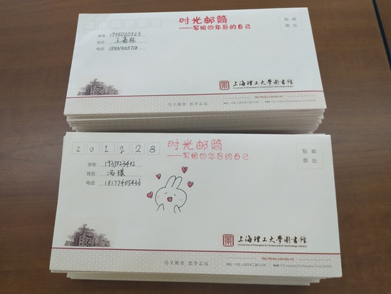 为更好地发挥学校图书馆的育人功能,激发2019级新同学们对大学生活的热情,鼓励他们思考人生、展望未来,学校图书馆于9月16日至9月30日举办了“时光邮筒”活动。 本次活动是图书馆开展的“明志·梦想·初心”2019读书推荐系列活动之一,以“写给四年后的自己”为主题,在校本部图书馆一楼大厅和军工路1100号校区图书馆2楼设立邮筒,同时图书馆也为同学们准备了专用的信封和信纸,写完信后同学们自由投递到邮筒中,本次活动共收到了一百余封信件。图书馆整理并封箱保存这些写好的信件,到2023年的毕业季,根据姓名、学号发放信件。 图书馆作为学生活动的“第三空间”,在育人方面有着重大责任。以当下大学新生的角度给未来的自己写一封信,鼓励同学们与自己交流,记录他们在入学时的美好记忆和展望,调动他们对四年大学生活和学习的积极性,激励同学们为实现梦想而奋斗,有助于图书馆发挥的育人功能,贯彻图书馆的服务理念,这也是开展“时光邮筒”这一活动的意义所在。