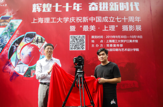 校党委书记吴坚勇和获得“辉煌七十年,奋进新时代”摄影大赛一等奖的栾博翔同学共同为摄影展开展揭幕