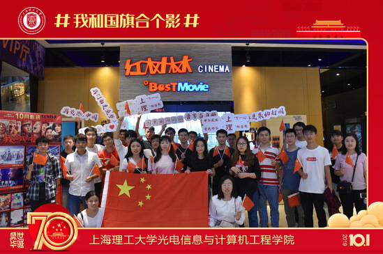 光电学院师生表演《上理人的中国梦》情景朗诵剧 观影告白祖国,厚植爱国情怀。9月30日,光电学院组织50名学生前往电影院观看《我和我的祖国》,向祖国告白。通过观看电影,激发上理学子的爱国热情。同时,大家通过齐声高喊“祝祖国繁荣昌盛,祝上海理工大学人才辈出,祝光电再创辉煌”向祖国表白,尽显青春风采。