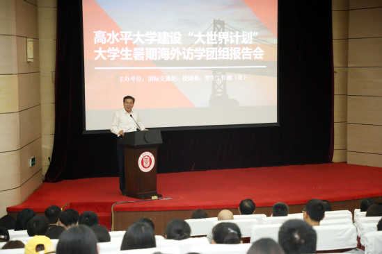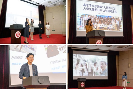 10月10日下午,我校高水平大学建设项目“大世界计划”——大学生暑期海外访学团组报告会在综合楼报告厅成功举行。此次活动由国际交流处主办,校团委、学生工作部(处)协办,校党委副书记、副校长盛春,副校长蔡永莲,相关职能部处、学院领导等出席了报告会。 此次报告会主要由暑期赴俄罗斯、英国、日本访学的学生团组进行成果分享和总结汇报,与全校师生一起交流暑期项目的收获和感悟。会议伊始,主持人国际交流处副处长蔡卉向大家介绍了我校海外交流项目的基本情况,国际交流处根据高水平大学建设项目精心设计,与校团委、学生工作部紧密合作,打造了学生海外学术文化交流项目——“大世界(Big World)计划”,旨在培养具有国际视野和跨文化交流能力的学生菁英,传播中华优秀传统文化。 报告会的第一部分是师生交流环节,赴俄罗斯拉阻尼国际夏令营、赴英国考文垂大学交流项目、赴日本的开拓学生国际视野项目和学生领导力提升——高水平大学建设“大世界”项目共四个交流团组的学生代表依次上台作总结报告,学生们用精彩的视频和动人的演说向全校师生们分享行程中的经历。暑期交流包括实践课程、实验室参观、分组研讨会、名企参观、城市观光和文化交流等环节,从视频中大家脸上洋溢的笑容里可以感受到此次行程对每个人来说都是一段难忘的经历。随后,带队老师们上台分享心得,他们分别用“神奇”、“收获”、“自豪”形容了此次行程。团组们在各类课程项目、文化互动环节的卓越表现,令外国朋友眼前一亮,他们在国际舞台上展现的蓬勃朝气和优秀的综合素质,展示了当代中国青年积极向上的精神风貌。 报告会的第二部分,副校长蔡永莲对交流团组中表现优异的学生进行了表彰,为他们颁发了“中华优秀传统文化传播大使”证书,充分肯定他们在海外访学过程中积极弘扬中华优秀传统文化的爱国意识和高度的责任感。校党委副书记、副校长盛春作了总结讲话,他指出,国际交流处、校团委、学生工作部紧密联合,共同推进了高水平大学建设,为学生搭建了开阔国际视野的平台,助力学生成长成才。寄语青年大学生刻苦学习,全面发展,积极参加各类国际交流项目,传播中华优秀传统文化。