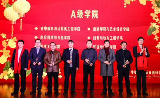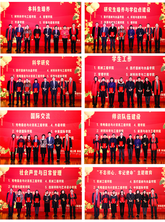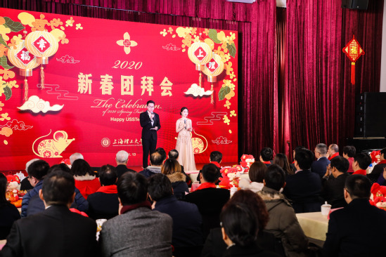 金猪辞旧,瑞鼠迎春。1月13日上午,“幸福上理”2020新春团拜会在学校小礼堂举行。全体校领导和庄松林院士、顾敏院士,杨浦区、长白街道、定海街道领导,一校八院(所)、普陀区教育局、黄浦区储能中学等合作单位领导,上海出版印刷高等专科学校、上理附属市东医院、附属中学、附属初中、附属小学、附属实验学校、附属幼稚园等大学系统单位领导,学校历任党政领导、曾在学校工作的领导、离退休老同志,市(区)人大代表、政协委员、各民主党派、统战团体负责人,校办企业相关单位负责人、学校各部门(学院)负责人和师生代表等150余人欢聚一堂,共迎新春。 时代洪流滚滚向前,初心温度恒久如初。主题视频《致敬追梦人》以2019年上海理工大学发展大事记为叙事脉络,集中展现了上理人勇于创新的气魄和不懈追梦的果敢,一件件丰收成果则描绘了上理人向特色显著的一流理工科大学而奋力谱写的辉煌篇章。 校党委书记吴坚勇代表学校致新春贺词。他首先向各级领导、合作单位、离退休老领导、老同志、海内外校友以及长期以来关心支持学校发展的各界朋友,向团结奋斗的全校师生员工表示衷心的感谢和美好的祝福。他指出,过去的一年,学校以习近平新时代中国特色社会主义思想为指导,深入开展“不忘初心、牢记使命”主题教育,全面加强党的领导,始终坚持立德树人根本任务,不断推进“三全育人”综合改革。全校师生团结一心、锐意进取、爬坡跨坎、努力拼搏,在前进的道路上奋力奔跑,共同凝聚起了创建特色显著的一流理工科大学的上理智慧和力量。吴坚勇强调,2020年是具有里程碑意义的一年,学校高水平大学建设将迎来第一轮收获。全体上理人要坚定“为党育人、为国育才”的初心使命,只争朝夕、不懈奋斗、攻坚克难、善作善成;要在学校的事业发展中感受到家的温暖,让自己工作更安心、生活更舒心、对未来更有信心。随后,吴坚勇携全体校领导向所有来宾、全校师生、海内外校友、各界朋友拜年,向大家致以诚挚的新春祝福。 在新春团拜会上举行了颁奖仪式,对在2019年度部门考核和二级管理部门办学绩效考核中获得优秀的部门进行了表彰。 挚爱如斯,声情悠远。在文艺汇演环节,校长丁晓东携手沪江学院音乐系教师,以一曲《最美的歌儿唱给妈妈》将新春团拜会推向高潮,抒发了上理人对祖国、对党的朴实而真挚的情感;以诉说式音调和藏族民歌音调,朗朗上口、层层递进,表达了上理人砥砺前行、不懈奋斗,用实际行动贡献祖国伟大复兴的使命担当。与会领导、嘉宾和师生代表还一同观赏了由校工会、团委、沪江学院以及相关部门选送的相声、魔术、器乐合奏以及歌舞等精彩文艺节目。最后,团拜会在喜庆祥和的氛围中圆满落幕。