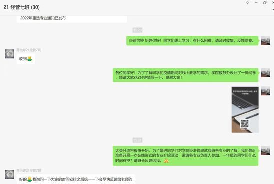 管理学院束义明老师在学生群里开展线上教学问卷调查 疫情期间,答疑辅导、学术讲座同样没“落下”。学校将陆续组织多场公共基础课的线上专题答疑辅导,帮助学生巩固线上学习成效。本科毕业设计指导工作仍按照既定时间节点推进,还将安排专家教授开展多场高质量的线上学术讲座。 除了线上教学,学校国际认证工作也在有条不紊地推进。中英国际学院继获批AACSB会员资格后,电子信息科学与技术和机械设计制造及其自动化两个工科专业通过英国工程技术学会(IET)认证,获5年最长期限认证,这也使学校成为上海市首个有工科专业通过IET认证的高校。