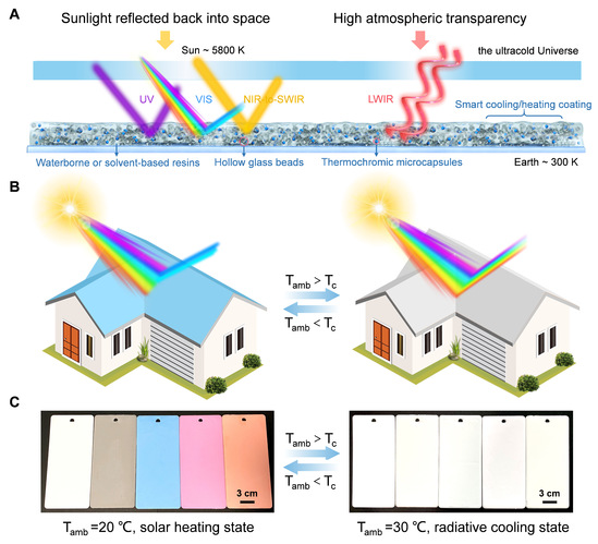 近日,顾敏院士领导的光子芯片研究院能源光子学创新团队张轶楠特聘教授、王彤特聘副研究员联合复旦大学报道了一种低成本、可扩展的自适应辐射制冷薄膜涂层,该工作实现了辐射制冷和太阳加热涂层的温度感知智能切换和大规模制备,将在全年建筑物节能方面具有非常高的优越性,同时在人工智能、光电子芯片、大数据中心的制冷方面将发挥重要价值。该研究成果以《一种用于自适应被动辐射冷却和加热的可扩展水性无二氧化钛热变色涂层》(Scalable and waterborne titanium-dioxide-free thermochromic coatings for self-adaptive passive radiative cooling and heating) 为题发表在《细胞》(Cell)子刊《细胞•物理科学报告》(Cell Reports Physical Science)上。光子芯片研究院特聘副研究员王彤和特聘教授张轶楠为该论文的共同第一作者。 辐射制冷作为一种利用热辐射将物体的热量通过大气透明窗口传输到宇宙的新技术,具有零能耗、零污染等优势,在建筑物、车辆、芯片、太阳能电池、衣物等方面发挥着重要作用。但迄今为止所报道的大部分辐射制冷材料无法感知外界环境温度的变化并自主做出相应的热调控行为,反而在寒冷的天气进行不必要的降温,徒增采暖成本,影响了该类材料的实际应用。针对这一问题,上海理工大学光子芯片研究院和复旦大学合作开发了一种可扩展的聚合物/空心玻璃微珠/感温变色微胶囊复合薄膜涂层,首次实现了自适应辐射制冷和太阳能加热集成材料的大规模制备,避免了传统辐射制冷材料的无效降温,让房屋在夏天保持凉爽,冬天保持温暖(图1)。测试结果表明,在夜间,复合薄膜涂层可降温~ 7.8 °C;在正午太阳光直射下,其仍可降温~ 7.1 °C。随着感温变色微胶囊的引入,热变色复合薄膜/涂层可随着环境温度的变化在超白和彩色之间自由切换,并有效调控对可见光的吸收和反射,实现了夏天辐射制冷和动态太阳能制热的灵活转变(ΔT cooling-heating = 9.5 °C)。类似一台无需天然气和电力、无排放的空调和暖气一体机,有望为现代化节能建筑的发展提供切实可行的解决方案。