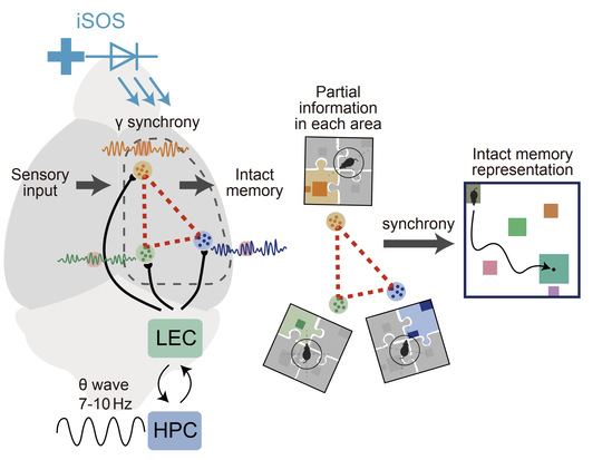 研究亮点 海马体与大脑皮层是哺乳动物中负责情景记忆的核心脑区。科学史上著名的失忆者H.M.(Henry Gustav Molaison)就是因为治疗癫痫而切除了双侧海马,进而导致了记忆的顺行性遗忘,不能形成新的记忆。在谢红研究员与管吉松教授课题组的前期合作中,相关的基础研究揭示了记忆印迹细胞网络在大脑皮层中负责情景记忆信息的存储(PNAS 2014, Cereb Cortex 2019),这样的分布式稀疏编码神经元在功能上具有记忆与信息存储能力。然而,这些皮层中,各个功能脑区内分布式存在的记忆印迹细胞是如何配合在一起记录信息的并不清楚。 该研究揭示了海马体和大脑皮层在学习过程中的相互作用机制,以及大脑皮层中记忆信息存储与提取的基本编码原则:首先,该项研究首次揭示了海马体HPF通过其外侧内嗅皮层(Lateral entorhinal cortex,LEC)投射到包括视觉皮层、感觉皮层、运动皮层和压后皮层等广泛的皮层浅层区域,诱导多个脑区皮层脑电的γ周期振荡的同步化,从而调节了各区域中的记忆印迹细胞并整合形成完整的记忆写入和提取(图2)。研究者构建了有趣的迷宫行为范式。研究发现,在记忆过程中,小鼠的脑电波变得同步了。这是怎么一回事呢?原来多个神经元的同步活动会造成局部电场的周期震荡,所以脑电波能够反映局部神经元的活动一致性。一般来说不同脑区的主要的脑电波频率和相位是不同的,但是研究者发现在小鼠记忆过程中,如同军队训练时军人们整齐一致的身体动作般,不同脑区的脑电波趋于整齐一致了(同步化)。后续研究发现了海马体实现记忆写入的重要机制,即这种脑电波同步化其实是海马和外侧内嗅皮层诱导的,实现皮层各脑区之间的相互通讯,从而促进记忆大脑网络的形成。其次,该项研究进一步发现:局部的记忆印迹细胞在长距离网络同步化的编码调控机制下形成了对完整场景信息的展现,即皮层记忆印迹网络编码了场景相关的全局性整合信息;而通过海马θ波调制的γ周期性振荡信号是整合存储与提取相关全局性记忆信息的关键(图2)。从而揭示了全局性(整合)信息的分布式存储与处理编码原则,提示了大脑皮层记忆印迹网络的分散存储、整合提取的多感知记忆融合学习特性。