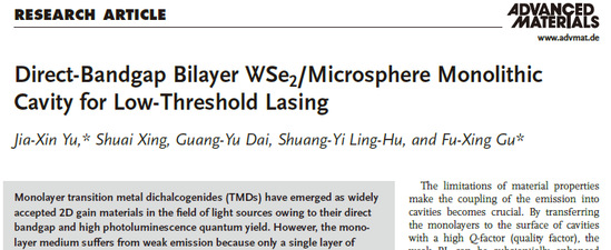 近日,庄松林院士领衔的未来光学实验室、谷付星教授课题组在国际权威期刊《先进材料》(Advanced Materials,影响因子30.849)上发表了题为“用于低阈值激光的直接带隙双层硒化钨(WSe2)/微球一体腔”(Direct-Bandgap Bilayer WSe2/Microsphere Monolithic Cavity for Low-Threshold Lasing)的研究成果。该论文由谷付星教授和于佳鑫副教授为共同通讯作者,于佳鑫副教授与博士生邢帅为并列第一作者。该研究工作的方案设计、实验、模拟工作均在上海理工大学未来光学实验室完成。