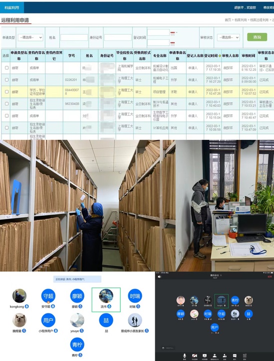 图书馆工作人员为读者取书 “闭馆不闭资源,闭馆不闭服务。”自闭馆以来,图书馆秉承“读者第一、服务育人”的理念,整合资源、精准推送,全员合力造就了一座“云中图书馆”,推出了“疫线服务”之“图书馆电子资源全攻略”,打通了从屏幕到指尖的“最后一厘米”。在这份攻略中,图书馆所订购的主要电子数据库和图书馆网站上电子资源的校内外访问方式一览无遗。 为了让读者“多读书、读好书、善读书”,图书馆在做好疫情防护的同时,不忘用书香丰润师生心田。在4月23日第27个世界读书日来临之际,图书馆公布了“2021年度图书借阅TOP10”,并推出了“上理读者请签收——馆员荐书”“书香疗愈,共克时艰”“读智库报告——看疫情下的经济社会”等一系列读书活动。文检课在线教学、科技查新和文献查收查引“线上+线下”双模式、各类线上讲座等,不仅为今年的“世界读书日”增添了别样情趣,更让读书成为师生战疫生活中不可或缺的部分。 档案业务“线上办理一键通,线下只跑一次腿” 校园封控期间,师生校友的档案利用需求如何满足?“线上办理一键通,线下只跑一次腿。”特殊时期,面对各种档案利用需求,档案馆除了做好日常电话接待、邮件回复工作,还积极落实档案利用“云帮办”:校外人员只需登录“上海理工大学档案远程利用系统”提出需求,只要满足档案利用法规,即可开具相关证明;校内人员查档时,在严格遵守学校疫情防控规定的前提下,可前往窗口进行业务办理。 在线上线下联动、确保对内对外服务畅通无阻的同时,档案馆今年还肩负着复兴路校区校史馆建设这项重点工作。为保证该馆如期竣工,档案馆坚持每周与展陈设计公司召开线上视频会议以及部门内部协调会,深化细化展陈设计方案,统筹分配工作任务,从文案、展板、实物、艺术装置等多方面着力推进。此外,档案馆还集体报名参加了全国博物馆展览实践高级讲习班,利用每天晚上的休息时间进行线上学习,以汲取全国各地博物馆的优秀展陈设计理念,融入校史馆建设项目,为建设一个充满美感与内涵的校史馆而不懈努力。 坚持召开线上馆务会议和支部党员大会,档案馆在积极推进各科室年度工作任务外,压紧压实疫情防控的政治责任,全员积极参与抗疫志愿服务工作:靳海进、于喆第一时间返校参加疫情防控;时瑞、魏煜星等人参与学校流调,为学校疫情防控决策提供依据……他们用实际行动筑起一道守“沪”“理”的防护墙。