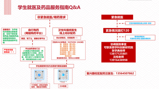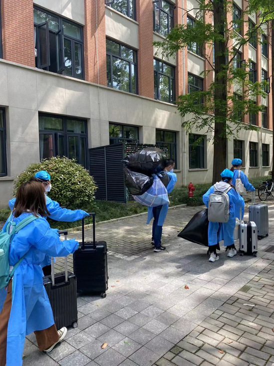 转运组老师护送学生返回宿舍 “每天都想着要跑赢送物、送药接力赛” 严格落实校外药品静置满24小时后,进行1小时紫外灯消杀,拆开外包装,再次进行1小时紫外灯消杀;网购药品安排专门配送志愿者,全程穿戴防护服、佩戴面屏等装备,单独设置配送路线,做到不交叉……为了缩短网购药品从校门到师生手中的时间,学校发布了“就医及药品服务指南”,并组建了紧急药品配送的志愿者团队。