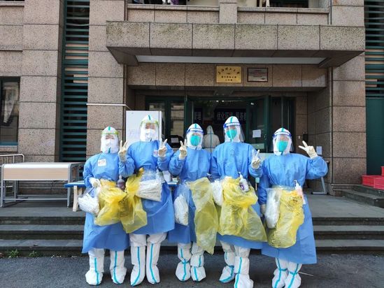 “我的电脑和做毕设需要的资料落在实验室,请问怎样才能拿到”“我有点不舒服,刚向卫生科老师电话问诊了,麻烦帮忙代取一下药品”“在‘尚理送’下单了日用品和零食,希望能尽快拿到”……封控管理期间,面对校内种种需求,干部教师们纷纷化身“大白团子”“小蓝精灵”,每一天全力冲刺在属于自己的赛道上。 “小小棉签、密不透风的防护服背后是专业和责任” 衣服湿透、捂干、再湿透,蒸气笼罩面罩、视线模糊,长时间戴N95口罩呼吸不畅,重复动作胳膊酸软无力……自4月26日校内核酸采样组成立以来,22名教师、30位学生志愿者每天都在适应这样的状态。“穿上防护服,便是一个战士,肩负使命出征。从专业教师化身‘大白’,手中的教棒化作棉签,更加能体会到医护人员的辛苦与不易,核酸采样组是学校疫情防控第一防线的尖兵连!” 核酸采样组女队负责人、体育部主任朱晓菱老师颇为自豪地说道。