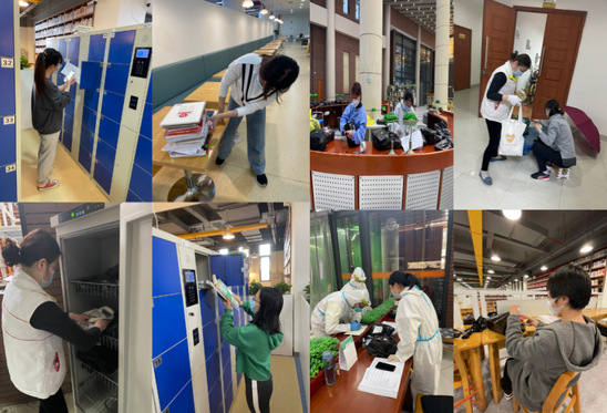 图书馆教职工为读者取出图书资料 学校还临时组建了一支由13位学生志愿者的送药、送物机动团队,他们不断完善优化取物方式,为保证配送安全又准确无误,制定出了“三核两沟通一留存”操作规范,在遇到紧急突发情况时,更是一事一议,尽量保证有需要的同学都能及时取到所需物品。