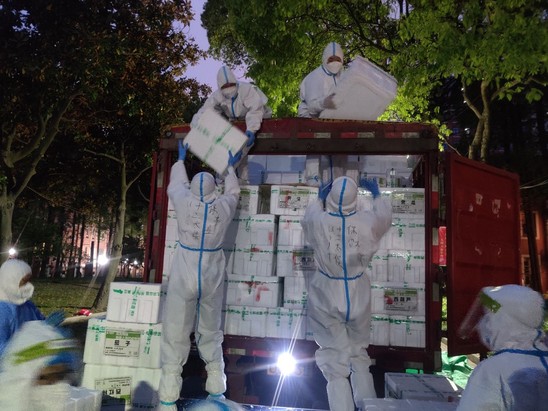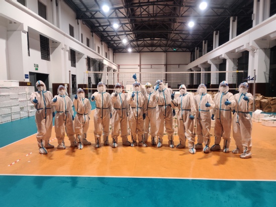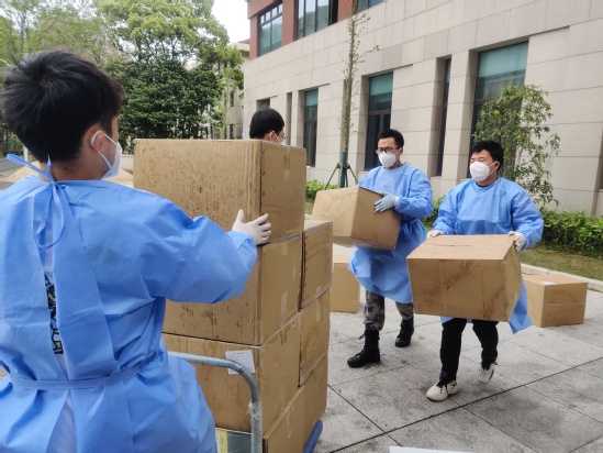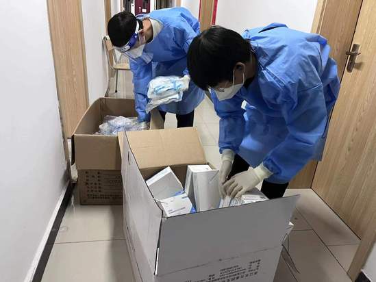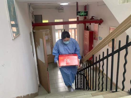 物资搬运小分队搬运分发防疫物资 “臂膀厚实了,也更有力量了” 协助“大白”完成核酸检测工作、搬运餐食、对物资进行消杀和分发、协助辅导员统计每日抗原情况……这些都是复兴路校区第四宿舍党员志愿者陆诗雯最近的日常。其中,送餐和送物资是个“体力活”,全靠陆诗雯和其他志愿者徒手搬运,刚开始她甚至扭伤过腰,慢慢就摸索出了“窍门”,将水果和饮料等进行二次分装,上下楼多跑几趟。