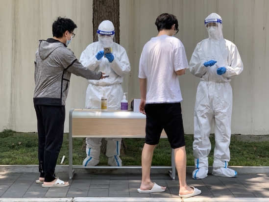 南四宿舍临时党支部成员担任核酸扫码志愿者 这个“建在宿舍楼里”的党支部由2021级机械学院和环建学院的研究生组成,有37名正式党员、8名预备党员。不同于院系党支部成员居住分散的特点,宿舍楼临时党支部的存在,可以最大程度凝聚楼栋内的党员力量,在党员同学的带动下,领餐、做核酸、发放和查验抗原试剂,楼层志愿者们各司其职,共同筑牢宿区战疫防线。“我们成立了楼栋疫情防控工作小组,大家群策群力,更新管理方案、形成正规文件、培训志愿者,经由楼长老师确认后实施,为楼宇的疫情防控打下‘定海神针’。” 在校园防疫“战场”上,像这样的宿区临时党支部共有5个。军工路校区北区十宿舍“平安光子”党员志愿服务队临时党支部书记、光电学院郭敬铭感慨:“对于很多同学们来说,临时党支部的存在本身就是‘定心丸’,党员冲在最前面,为大家做好表率,我们的努力也增强了身边同学们的战疫信心,大家拧成一股绳共同守护楼栋的安全。”