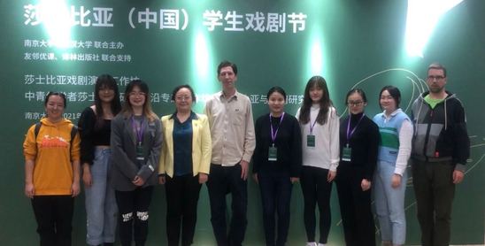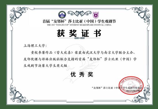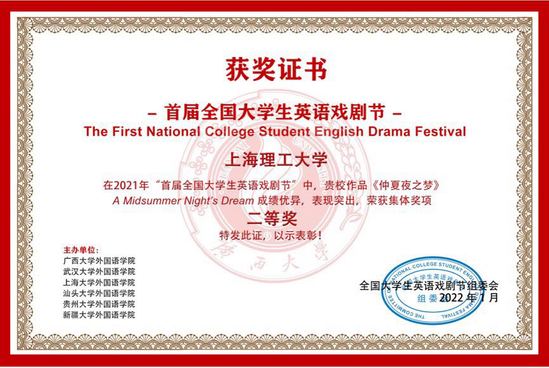 获奖证书 两大赛事虽属初创,但都因组织方权威性高、评奖流程科学规范等特质而让所评奖项具备了较强的业内影响力。“首届全国大学生英语戏剧节”由广西大学联合武汉大学、上海大学、新疆大学、汕头大学、贵州大学等5所国内高校举办。自2021年5月始,历时9个多月,本项赛事在经受疫情等不利因素的考验后,终于在今年1月以参赛视频评比的方式结束。在外语院莎剧社总指导王影君老师的带领下,参与排练的指导老师和学生演员各司其职,团结协作,克服课业压力大、排演难度高等具体困难,在截止日期前高质量完成了演出视频的摄制与提交工作。最终,外语学院莎剧社选送的首届“莎剧节”剧目《仲夏夜之梦》在众多参赛作品中脱颖而出,荣获二等奖。 “首届友邻杯莎士比亚(中国)学生戏剧节”由南京大学、伯明翰大学、凤凰出版传媒莎士比亚(中国)中心于2019年12月3日启动,“邻优课”、译林出版社提供赞助支持,南京大学与武汉大学联合主办。因疫情影响而历时2年有余,本项赛事吸引了国内200多所大中学校选送作品参赛,主办方邀请了国内外著名专家全程参与评审。指导老师王影君、程雪芳带领学生演员环筱语、丁晨玥、石晰月、李侯聪等赴南京全程参与了“首届友邻杯莎士比亚(中国)学生戏剧节”线下活动。历经数轮评审之后,外语学院莎剧社选送的第二届“莎剧节”剧目《皆大欢喜》作为上海市唯一入选剧目进入到决赛环节,获大学生英语组优秀奖。